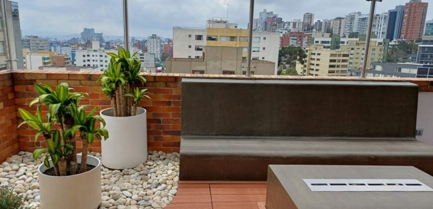 Es luminosa, cómoda, amplia; está cerca de centros comerciales, centros culturales, universidades, zonas financieras, restaurantes. El edificio tiene vigilancia 24/7. El departamento es iluminado gracias a ventanales que dan a una amplia terraza privada. El edificio cuenta con deck en terraza comunal y linda vista del centro norte de Quito.