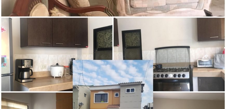 Frente a CIUDAD COMERCIAL EL DORADO, Alquilo casa de 2 pisos amoblada o sin amoblar. 3 dormitorios. 2 baños 1/2. sala, comedor, cocina, estudio, lavandería, amplio patio, garage para 2 vehículos. Cuenta con 1 splitt y 2 acondicionadores de aire de ventana. AMOBLADA: $ 650 (incluye alícuota) SIN AMOBLAR: $550 (incluye alícuota) Se verificará referencias laborales y personales. Interesados comunicarse: 09-97196019