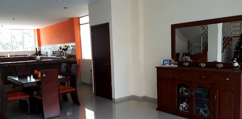 Nivel 2: sala con amplios ventanales que ofrecen iluminación natural, baño social, comedor, amplia cocina estilo americano, con vista completa hacia el comedor, con mesones de granito y cajoneras empotradas.