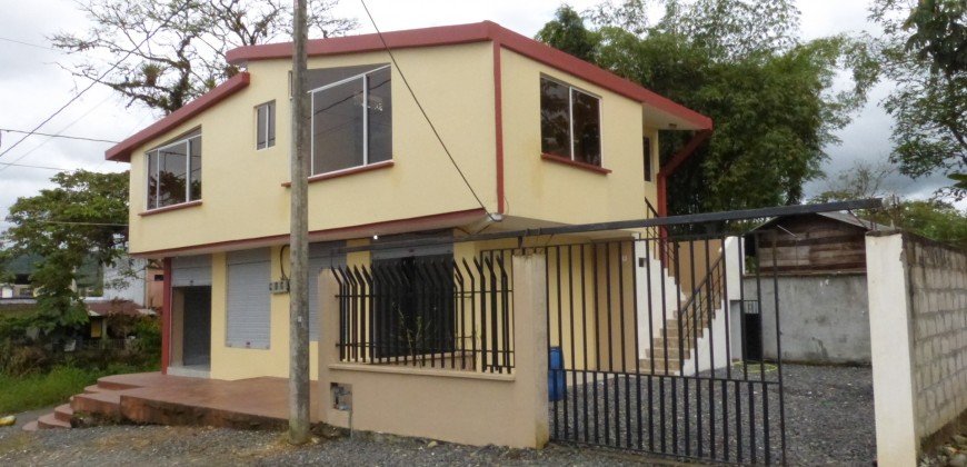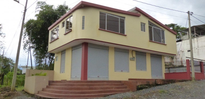 Casa de dos plantas,de concreto,ventanas de aluminio,vidrios de 6 lineas.PRIMER PIZO:Dos locales comerciales con baño cada uno.Un local tiene mezon,apto para cafeteria,comidas rapidas,etc.bodega,garaje para dos carros con cerramiento.SEGUNDO PIZO:entrada privada a departamento completo con sala amplia,comedor espacioso,cocina americana con porcelanato,anaqueles.Dos dormitorios espaciosos con closet cada uno,un baño en el master.Ademas hay un baño social,ducha electrica,grandes ventanales con vidrio de 6. La casa esta situada en la urbanizacion el pambay que esta a dies minutos de el centro caminando.Hay transporte publico,esta serca de escuela,colegio,universidad,iglesia.Esta cerca a el malecon,a pocos pasos de el sendero ecologico para su relajamiento.Es un lugar apasible para vivir cerca de la naturaleza,seguro,y de buen futuro.El costo es de $91.000 negociables.