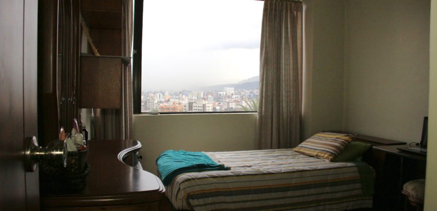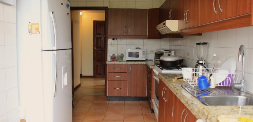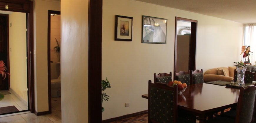 Departamento amoblado de 130 m2. Cuenta con 3 habitaciones, 2 baños y medio, un garage y un espacio cerrado en la terraza. Los acabados son nuevos y los muebles en excelente estado casi nuevos. Tiene todo lo que necesita: cocina, refrigeradora (con congeladora), juego de cubiertos, juego de muebles de sala, juego de comedor, 3 camas (una en cada habitación), libreros, más otros muebles y accesorios extras. El edificio cuenta con ascensor, piscina, turco/sauna y amplias areas verdes con juegos infantiles. Está en el 5to. piso y tiene un vista hermosa al Parque Metropolitano.