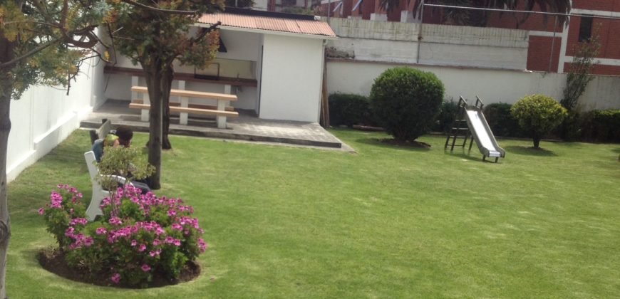 Hermoso departamento 7mo. piso linda vista, 2 dormitorios, master con baño y walking closet, sala comedor, cocina, muebles altos y bajos, piso de tablón, lavadora y secadora, 2 parqueaderos, 1 bodega, 2 ascensores, área verde y juegos de niños, sala comunal, terraza con área de BBQ, guardiania las 24 horas, 7 años de construcción,